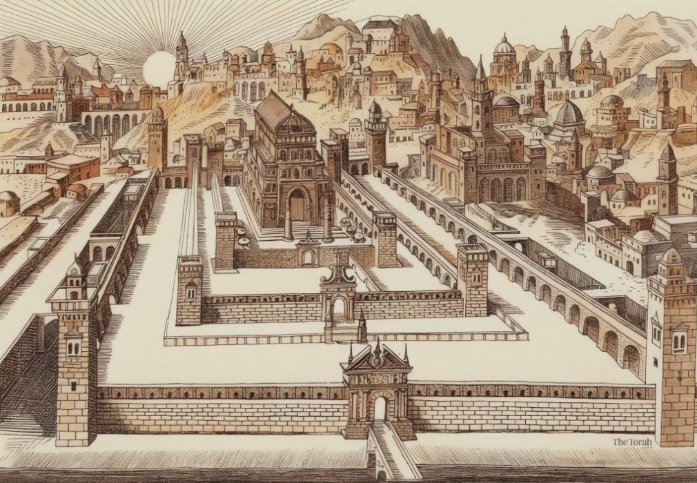 המקדש בירושלים מתוך הגדת אמסטרדם, 1695 (מותאם). האנציקלופדיה היהודית, ויקימדיה.