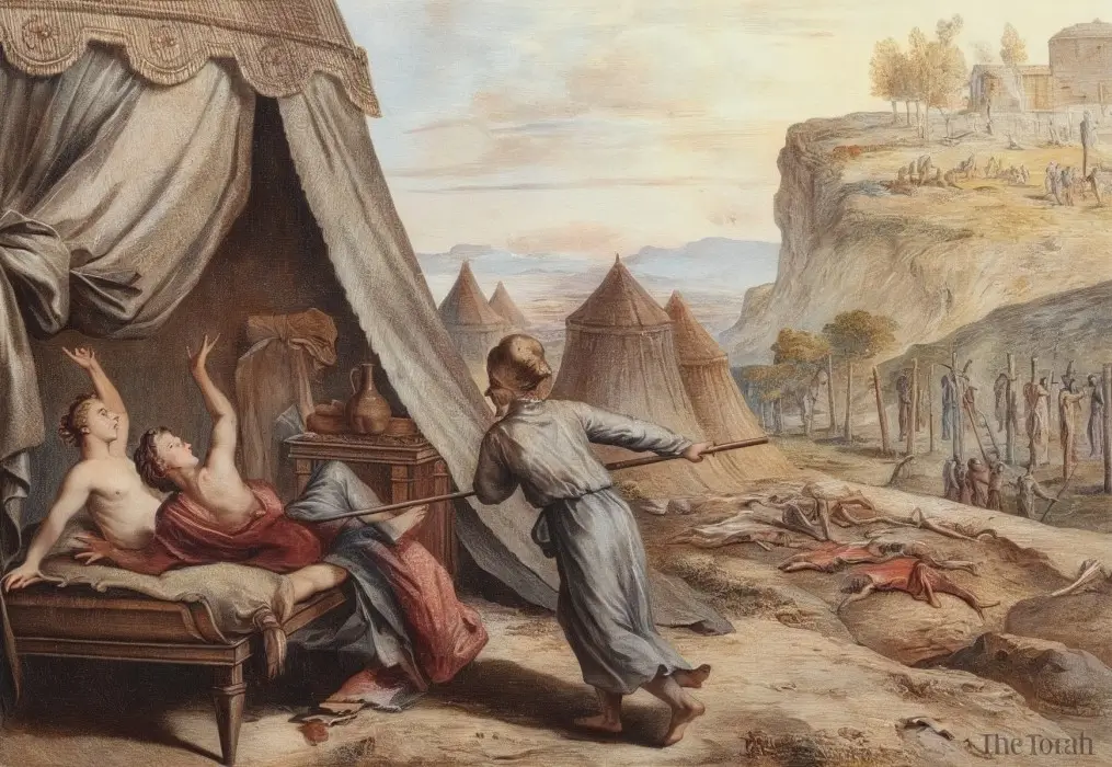 במדבר כה:ז וַיַּרְא פִּינְחָס בֶּן אֶלְעָזָר בֶּן אַהֲרֹן הַכֹּהֵן וַיָּקָם מִתּוֹךְ הָעֵדָה וַיִּקַּח רֹמַח בְּיָדוֹ. כה:ח וַיָּבֹא אַחַר אִישׁ יִשְׂרָאֵל אֶל הַקֻּבָּה וַיִּדְקֹר אֶת שְׁנֵיהֶם אֵת אִישׁ יִשְׂרָאֵל וְאֶת הָאִשָּׁה אֶל קֳבָתָהּ וַתֵּעָצַר הַמַּגֵּפָה מֵעַל בְּנֵי יִשְׂרָאֵל.[2]