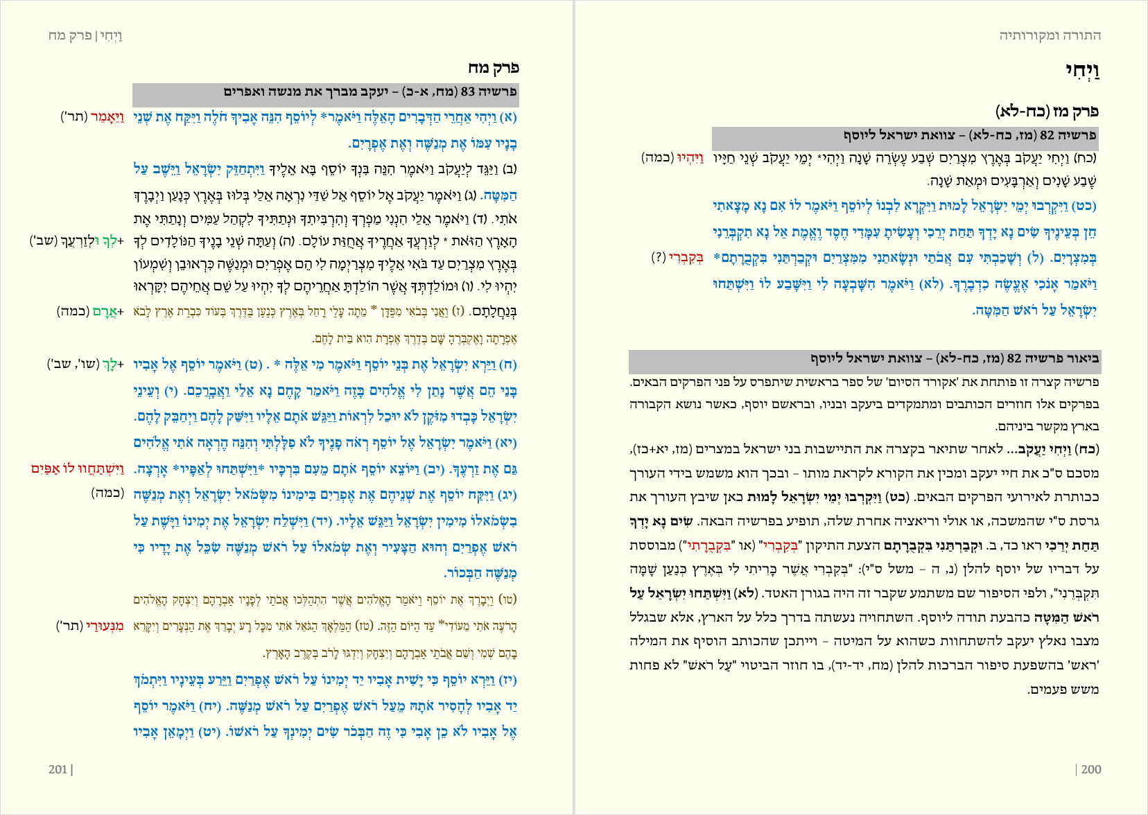 - חלוקת מקורות: לכל מקור משוער בתורה (P = כהני, J = יהוויסטי, E = אלוהיסטי) מוקצה גופן וצבע, המאפשרים לקורא להבחין באופן חזותי במבנה הקטע.